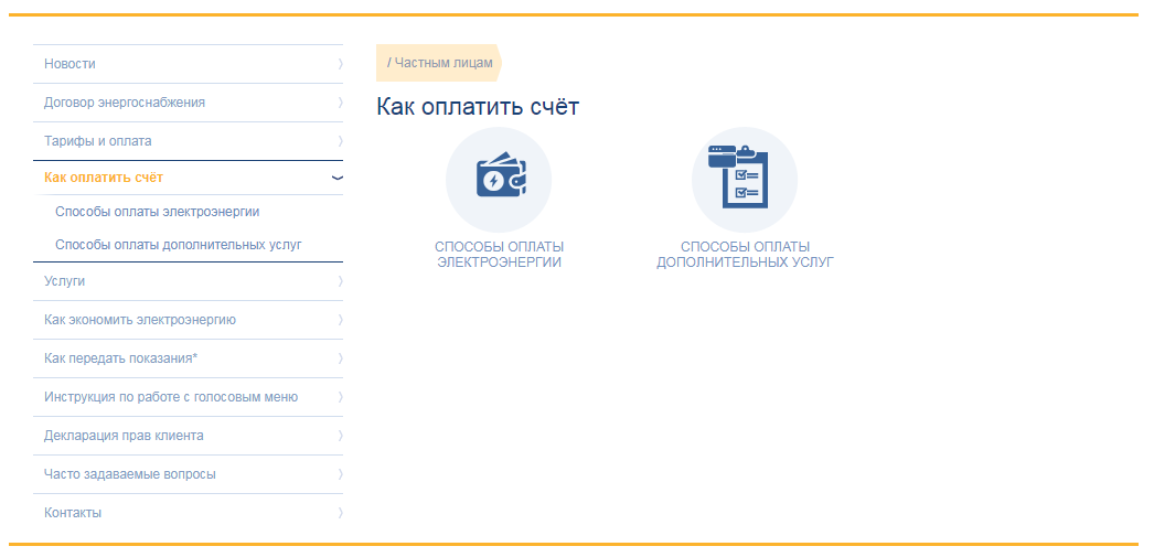 Рядом с предыдущим разделом на главной странице официального сайта Мосэнергосбыта находится раздел «Как оплатить счет», в котором нужно перейти в подраздел «Способы оплаты электроэнергии».