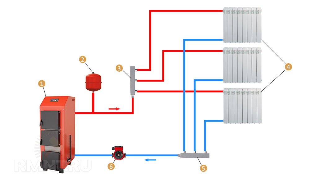 Лучевая схема отопления: 1 — котёл; 2 — расширительный бак; 3 — коллектор подачи; 4 — радиаторы отопления; 5 — коллектор обратки; 6 — циркуляционный насос