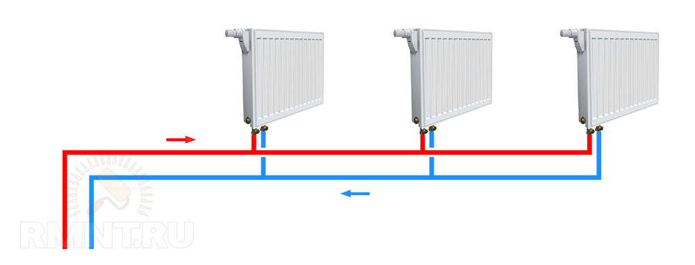 1. Двухтрубная тупиковая система — наиболее распространённый вариант устройства, неплохо подходящий для организации как центральных, так и индивидуальных контуров обогрева.