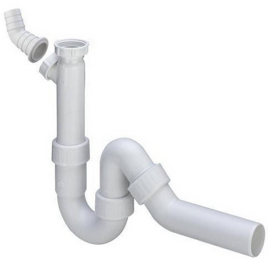 Двухоборотный. Конструктивно схож с коленным вариантом, но устроен сложнее. Сливная труба стыкуется с выходом сантехники, место соединения перекрыто фильтрующей решеткой. На ней задерживаются волосы и другой мусор. Трубное колено соединяется с дополнительной трубой, расположенной с незначительным уклоном. Она стыкуется со сточным отверстием. Подобный вид гидрозатвора надежно защищает от протечек, его можно регулировать и несложно установить даже в узком проеме.