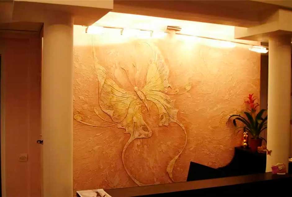 - Оригинальная текстура. Смесь напоминает мастику. При необходимости штукатурку можно разбавить водой. В раствор добавляется краска по выбору. Штукатурка наносится шпателем. Рисунок делается исходя из фантазии мастера своими руками. Время высыхания 1 сутки.