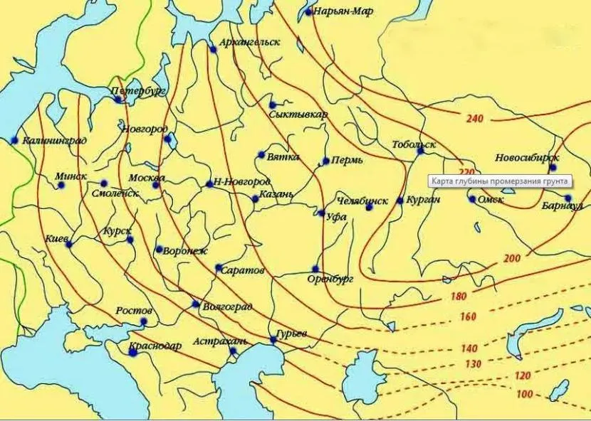 Так, в Москве глубина промерзания грунта составляет 1,4 м, в Санкт-Петербурге меньше – 1,2 м. При продвижении на восток и север эта глубина увеличивается – к примеру, в Нарьян-Маре она составит аж 2,4 м.