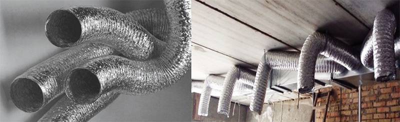 Гофра с алюминиевой фольгой на каркасе. Отличается невысокой прочностью покрываемого материала, но на кухнях для вытяжек применяется