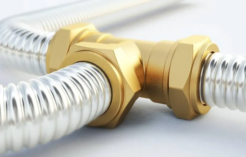 Для соединения нержавеющих гофрированных труб используется обжимной латунный фитинг с силиконовым или резиновым уплотнительным кольцом. В него вставляется конец трубы до упора и затягивается кольцом.