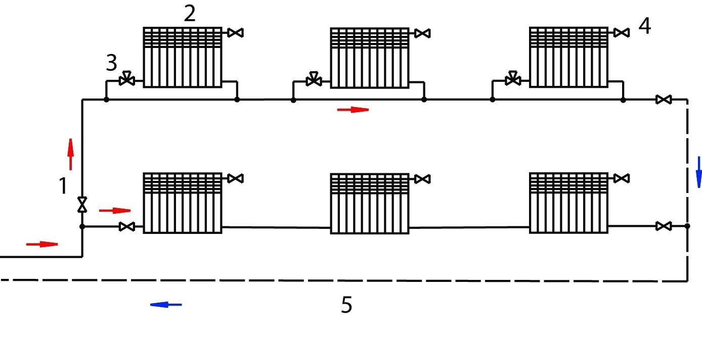 Также двухтрубная система отопления классифицируется по направлению движения теплоносителя, согласно которому она бывает прямоточной либо тупиковой. В тупиковых системах жидкость по трубам обратки и подачи циркулирует в разных направлениях, в прямоточных их движение совпадает.