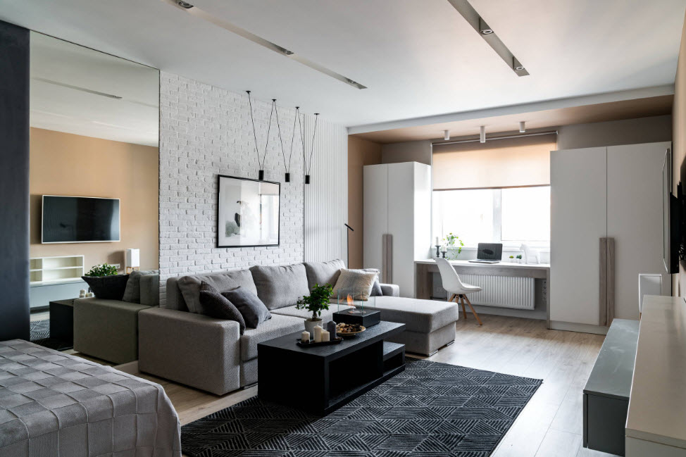 Выделение в одной комнате спального места и гостиной актуально для одиноких горожан со средним достатком. К совету дизайнера прислушается молодая семья в своей первой квартире-студии в новостройке. Или в однокомнатной хрущёвке, доставшейся от бабушки.