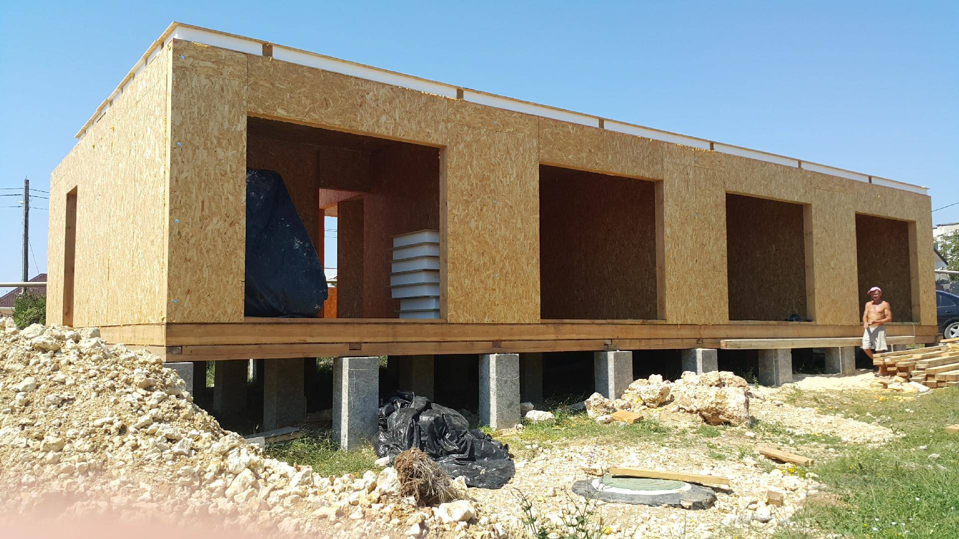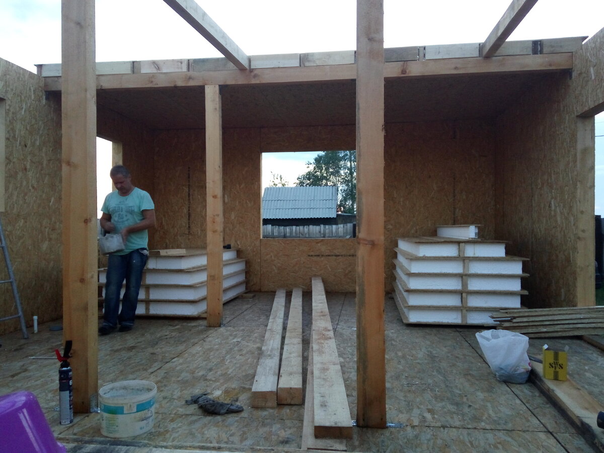 Сначала ставится каркас, а потом монтируются стены. Каркас создается из металлических труб, которые будут свариваться, ставиться на фундамент. Менее прочным, но все равно используемым типом каркаса считается каркас из деревянных брусьев. Для работы можно взять три стойки из металла, квадратного сечения. Для торца может хватить и двух стоек. Когда панели будут соединяться, они должны заходить одна за другую. Панели сип очень удобно режутся. При помощи пилы можно сделать детали любой формы.