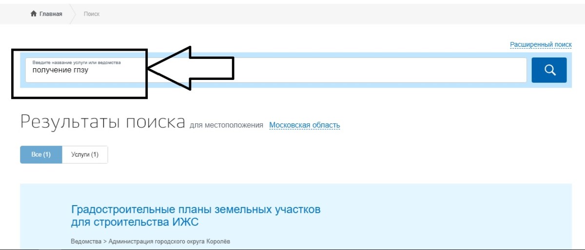 Для упрощения процедуры рекомендуется воспользоваться поисковой строкой и указать в ней следующий запрос — «Получение ГПЗУ».