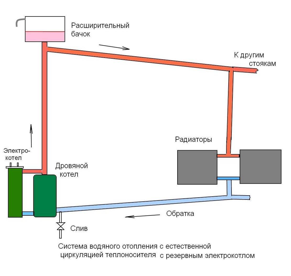 Назначение гравитационной схемы – теплоснабжение жилищ без привязки к электричеству, что актуально в отдаленных регионах с частыми отключениями света. Сеть самотечных трубопроводов и батарей способна работать вместе с любым энергонезависимым котлом либо от печного (раньше говорили – парового) отопления.