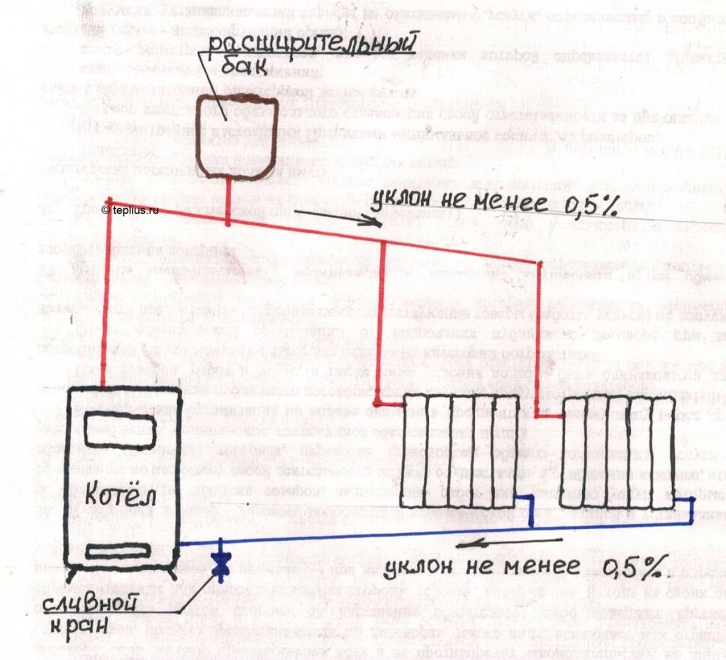 - чтобы «подстегнуть» естественную циркуляцию, горизонтальные участки прокладываются с уклоном 2—3 мм на 1 м магистрали;