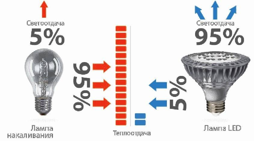| Распределение и потребление электроэнергии | Почти вся электроэнергия направляется на образование фотонов света. Энергопотребление в 8 — 10 раз ниже, чем у обычных ламп накаливания. | Большая часть энергии потребляется на накаливание нити, и незначительная — на образование света. Энергопотребление на 20-50% ниже, чем у обычных ламп накаливания. |