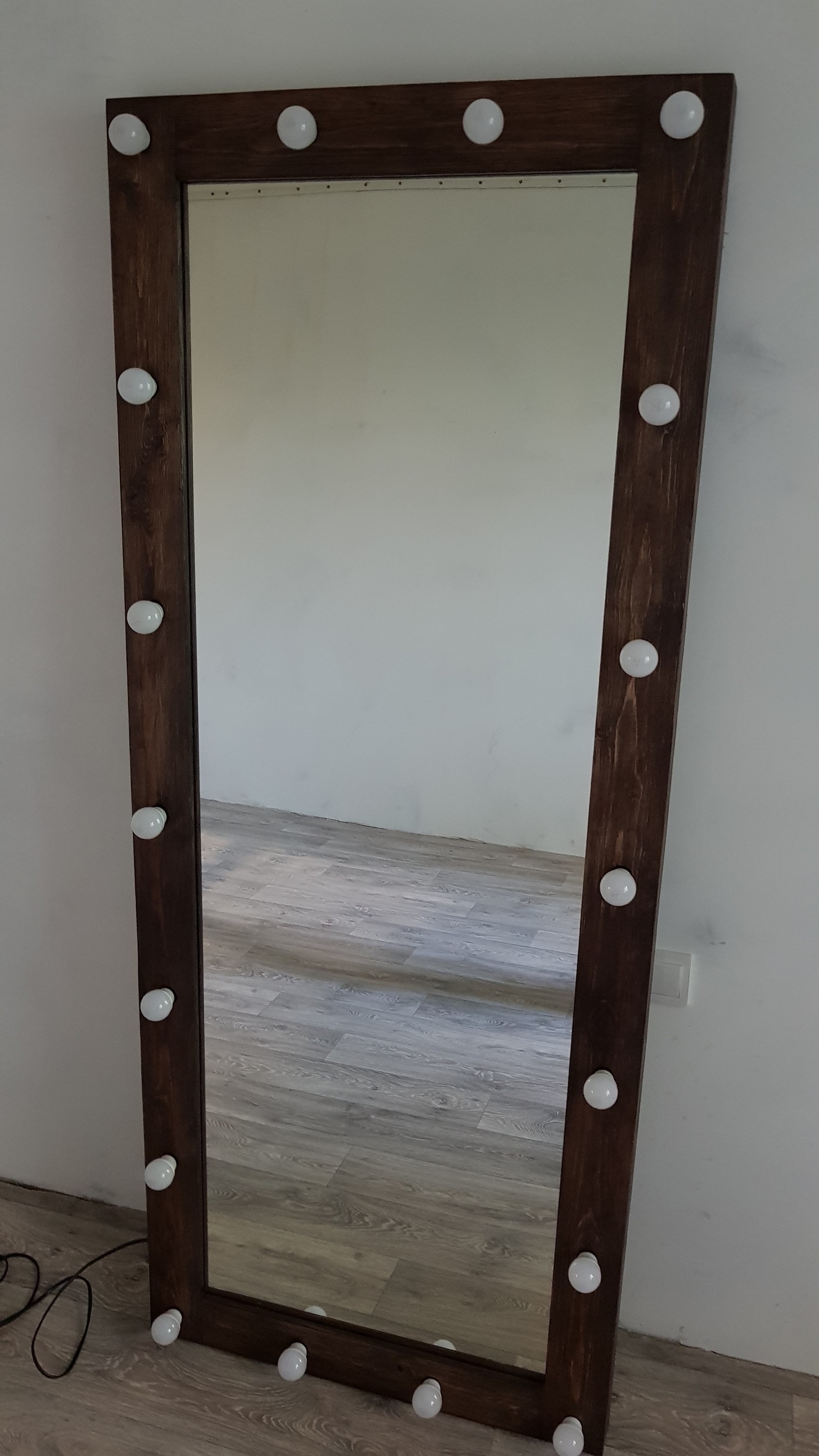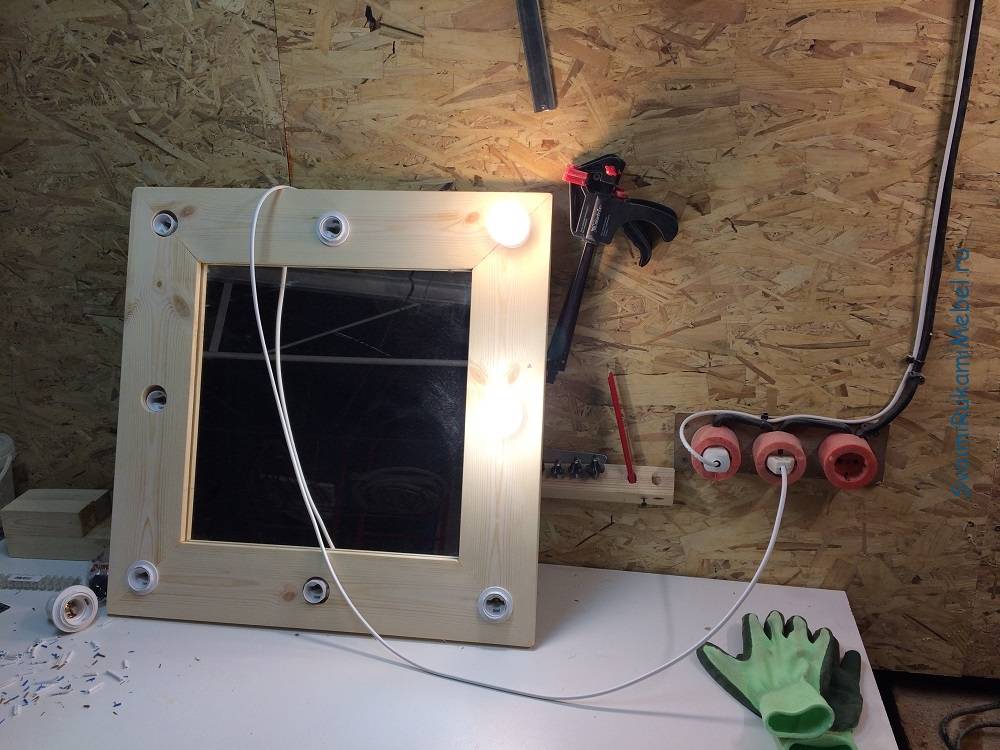 - Для того, чтобы сделать своими руками гримерное зеркало с лампочками, сначала нужно из деревянных брусьев вырезать раму по размерам зеркала распилив их так, чтобы концы имели углы по 45 градусов