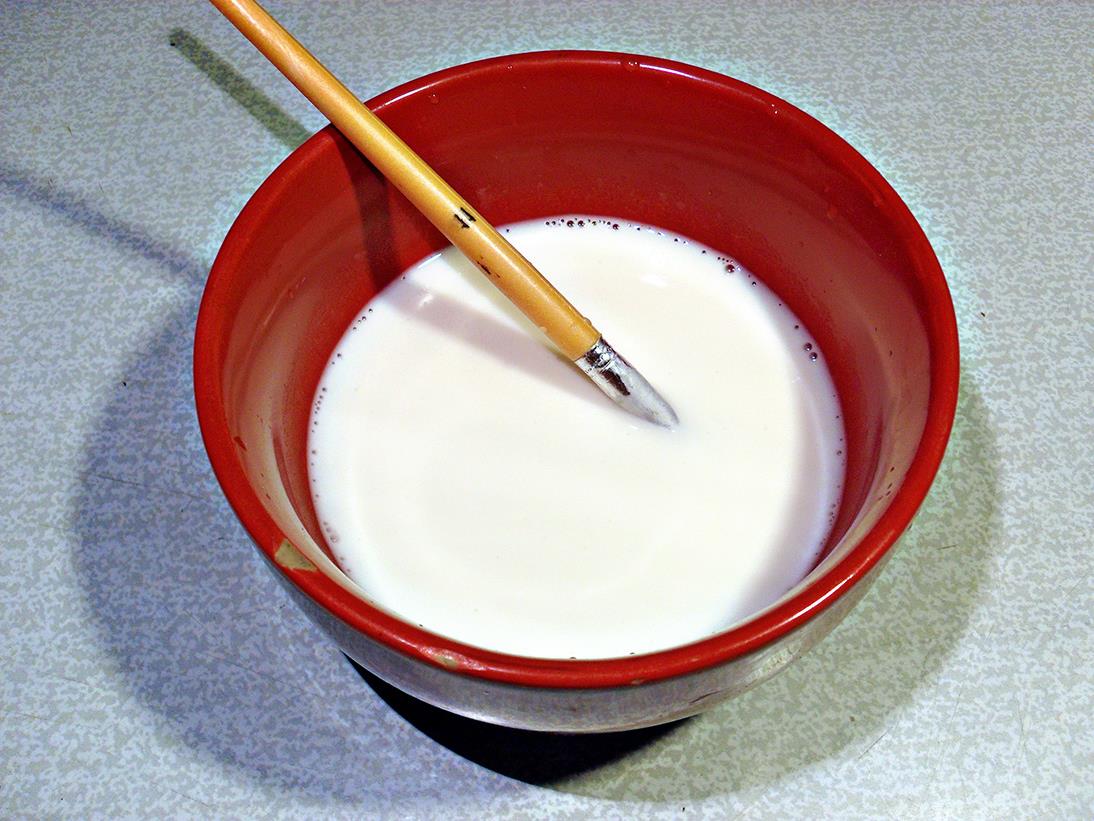 Состав обладает противогрибковыми свойствами и способен укреплять поверхность. На 7 л кипятка потребуется 500 мл столярного клея, 150 г медного купороса и 1 упаковка хозяйственного мыла, которое заранее лучше натереть на терке