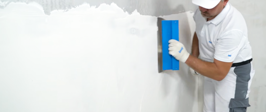 Узким шпателем (около 10 см) берется раствор и наносится на широкий (не меньше 42 см). Стена обрабатывается, широкий шпатель очищается, процедура повторяется.