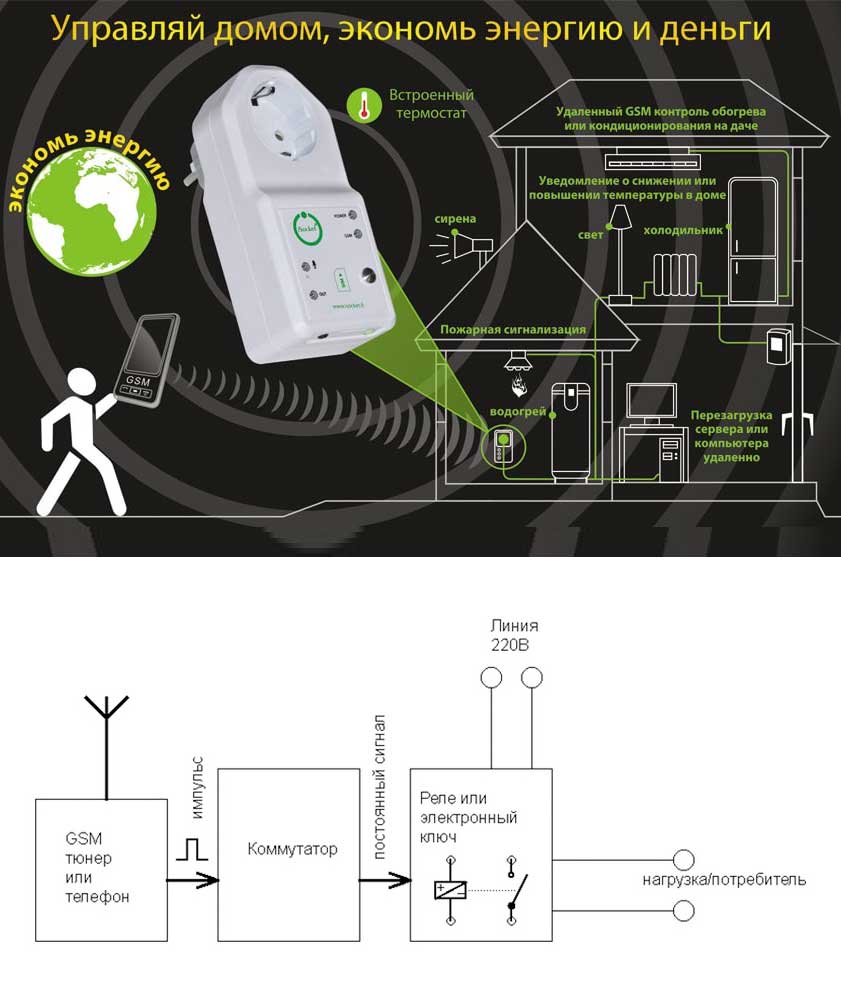 - управляемая с мобильного устройства по СМС, розетка-реле предлагает самые разные удобные варианты использования подключенных приборов, например, кондиционирование до прихода хозяев домой.