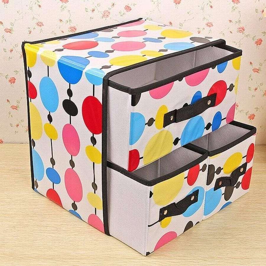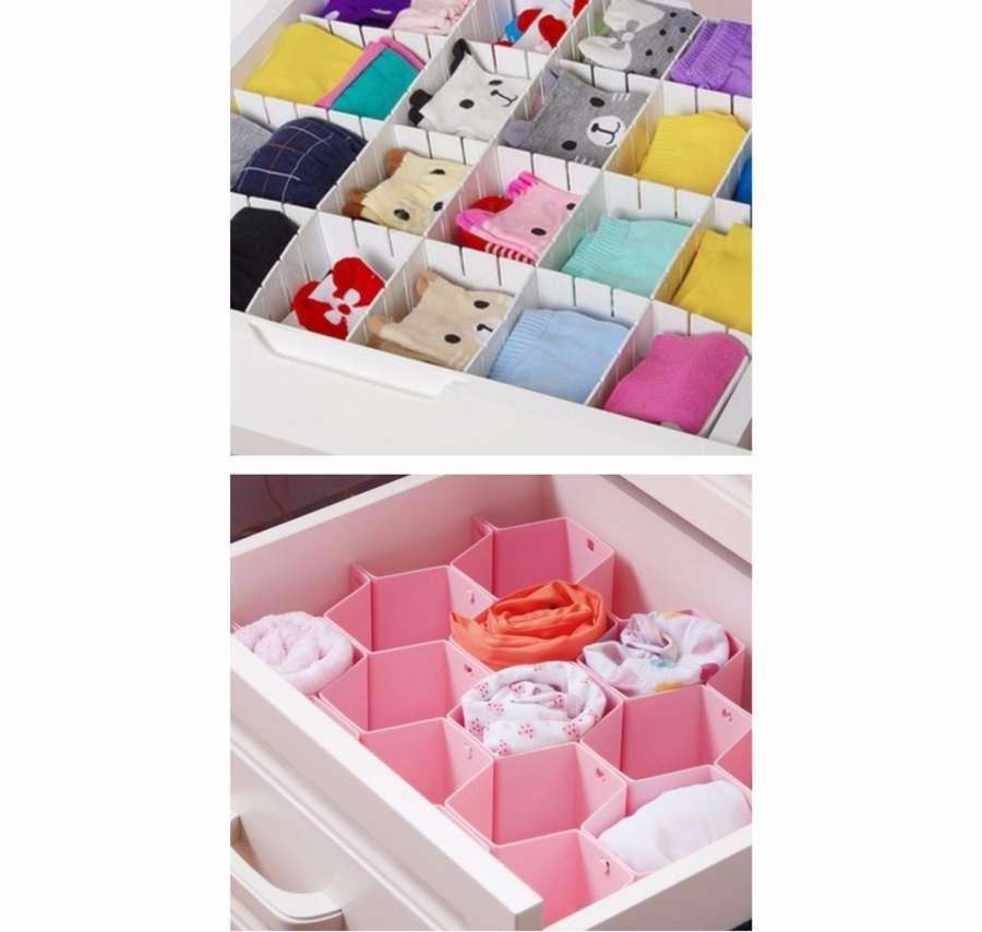 А вот идея для изготовления вместительного органайзера, который подходит для хранения детских носков, колготок и нижнего белья. Для перегородок (они могут быть прямоугольной формы или в виде “сот”) подойдет картон.
