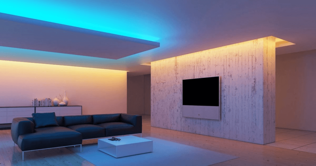 Удобно зонировать пространство при помощи разноцветной потолочной подсветки.