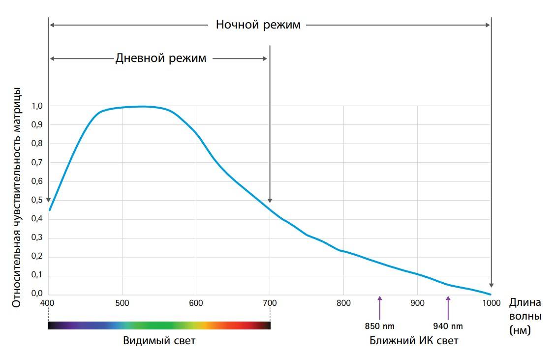 Диаграмма относительной светочувствительности матрицы видеокамеры видимого диапазона. В дневном режиме на матрицу попадает только видимый свет. В ночном режиме для получения видеоизображения используется как видимый свет, так и свет ближнего ИК диапазона, поступающий на матрицу.