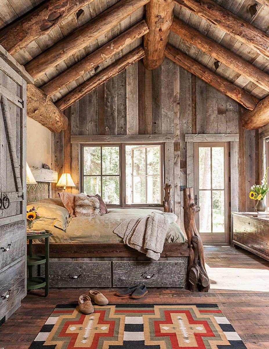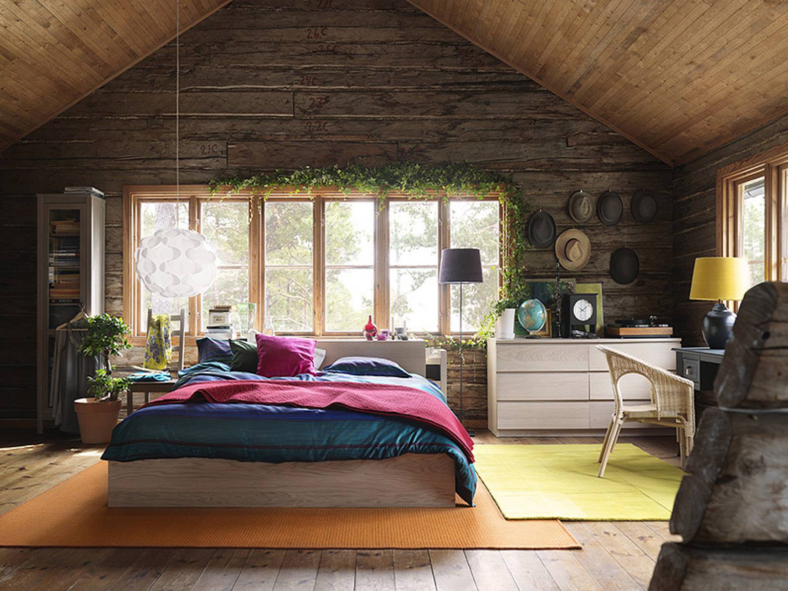 Интерьер деревянного дома имеет совершенно другую атмосферу. Основой этой вариации является правильно воспроизведенный эффект деревянных стен, дополненный текстилем в спальне. Это также способ поиграть с линейными и круглыми формами.