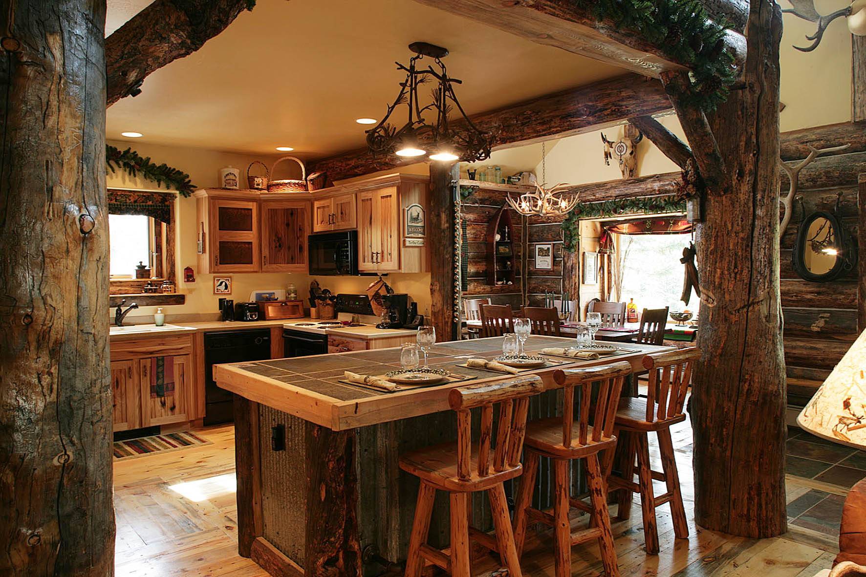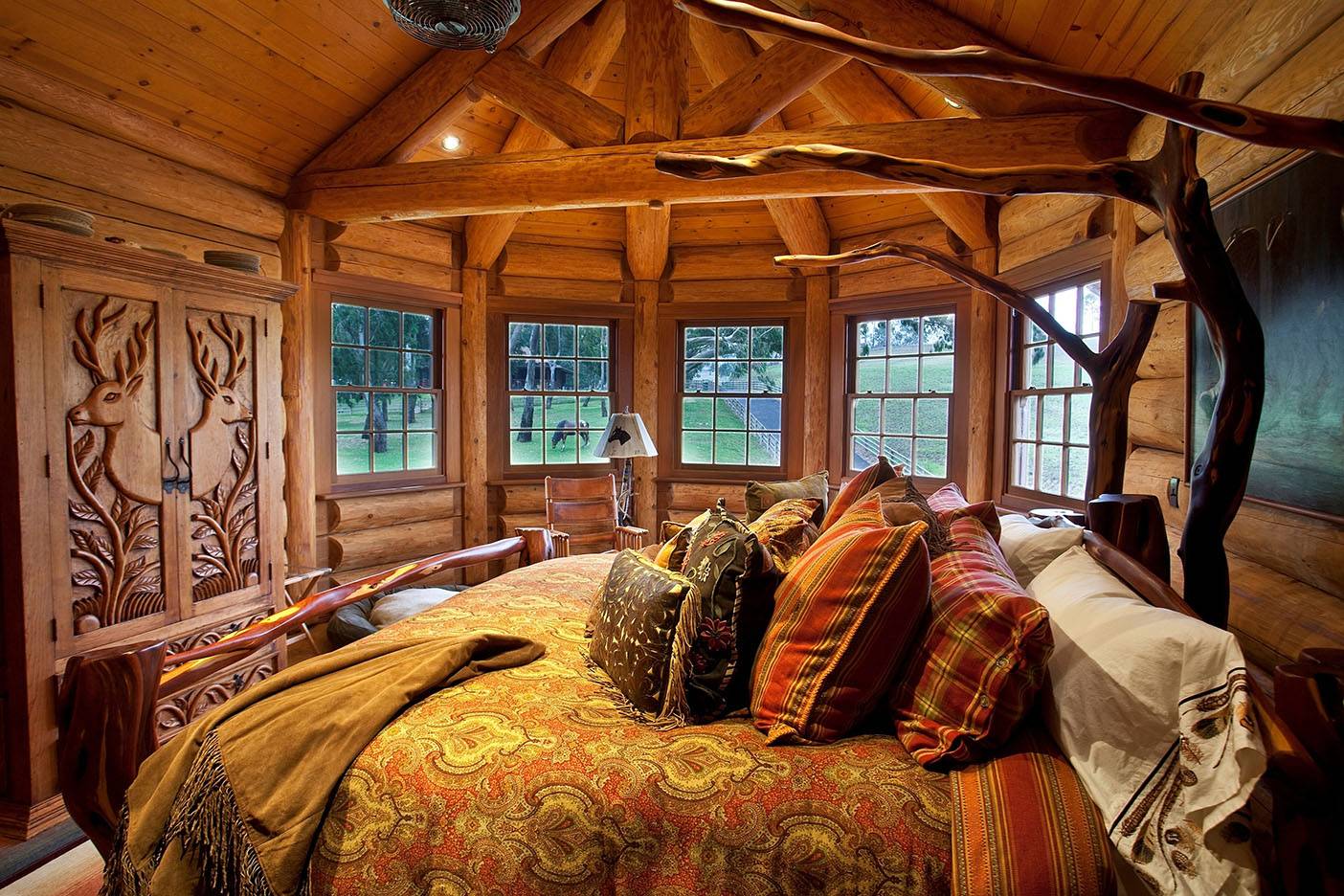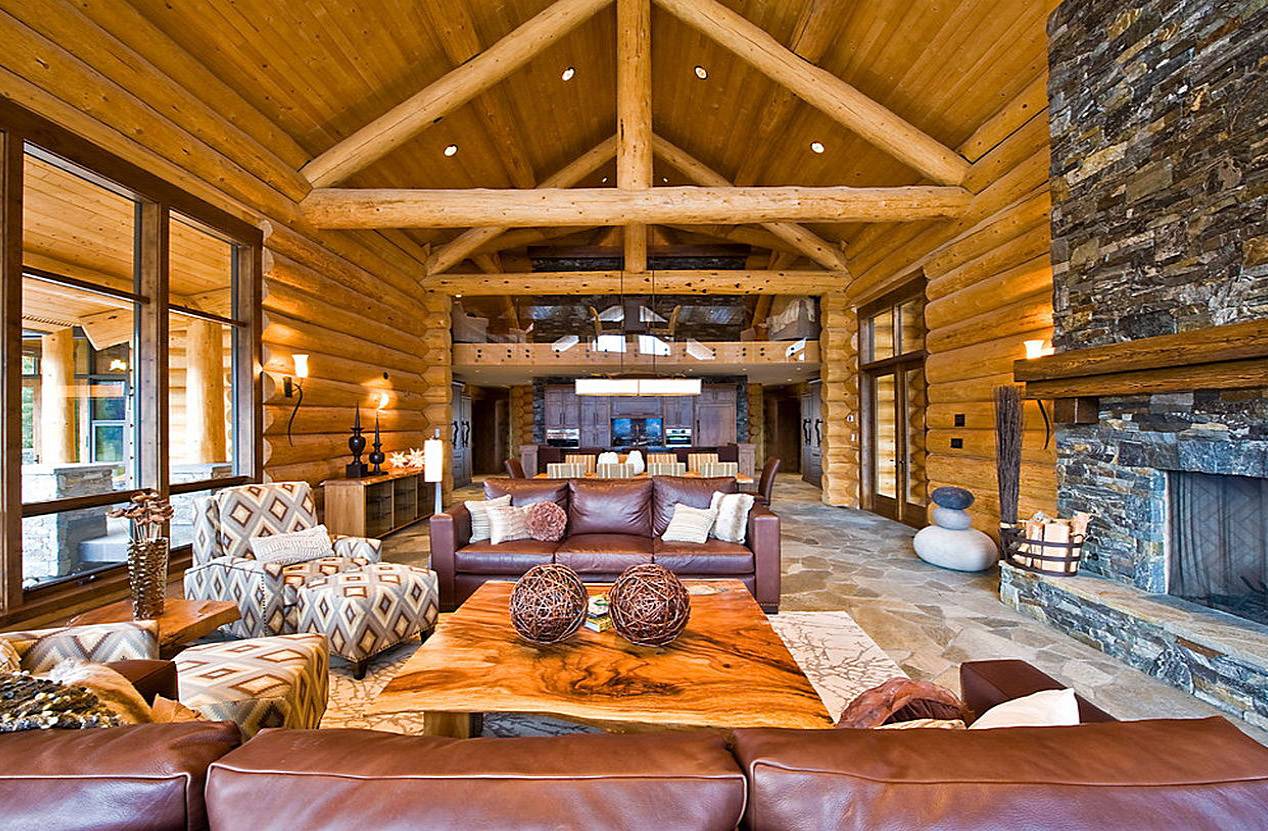 Дом из дерева очень похож на жилище охотника. В их интерьере должны присутствовать чучела животных, крупные кожаные диваны, различные трофеи.