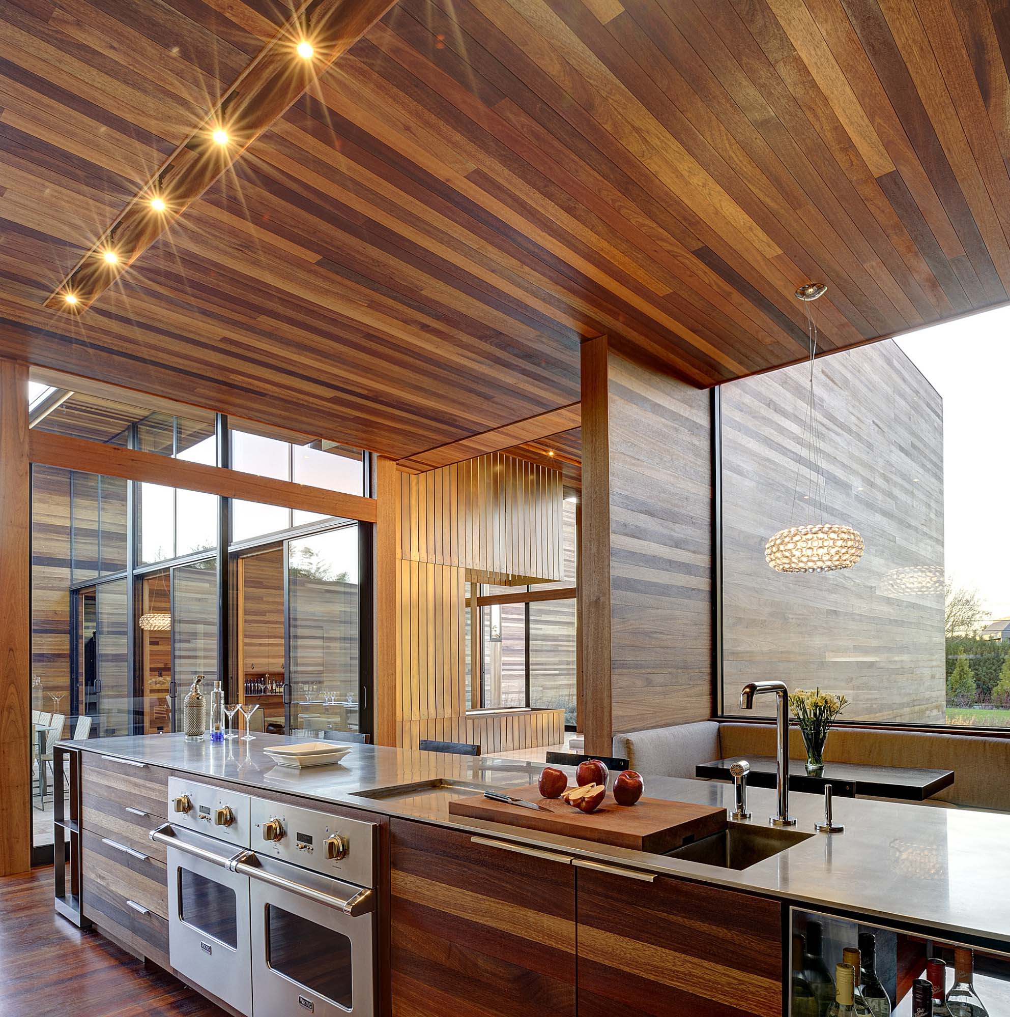 - Хвойные породы (сосна, кедр, лиственница, ель) не подойдут для отделки кухни, ванной комнаты, сауны или бани, а также каминной зоны, стен или пола с подогревом. Связано это с тем, что при нагревании такая древесина выделяет смолу. Но такая древесина идеально подходит для отделки жилых комнат, поскольку выделяемые ею фитонциды помогают бороться с вирусными заболеваниями.