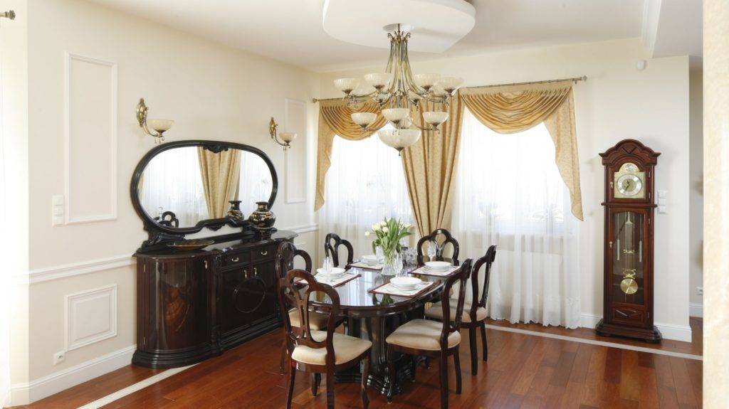 Помещение в котором решено реализовать дизайн интерьера в классическом стиле, должно обладать не меньшими достоинствами. Большие окна, высокие потолки для хрустальной люстры, да и просторная комната — это обязательное требование.