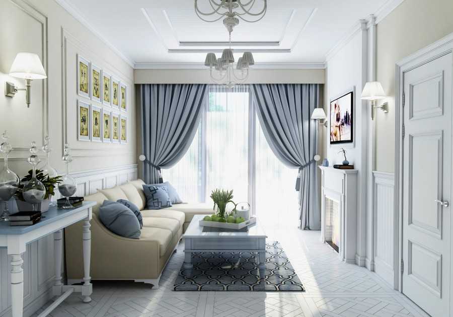 Классические залы будут современными при использовании встроенных шкафов, достаточно сдержанных элементов в декоре и трансформирующейся мебели. В таком интерьере обычно присутствуют простые поверхности, к которым легко подобрать несколько характерных деталей – пару вазонов или имитации колонн, панно в рамах или роскошную люстру.