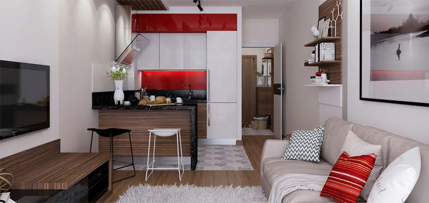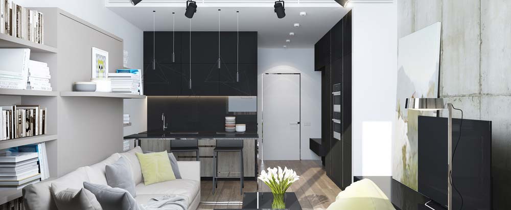Так, к примеру, если в квартире будет проживать один человек, идеально подойдёт такой вид дизайна квартир, как студия. Современный вариант интерьера, предусматривающий единое пространство по всему помещению. Говоря простым языком, явных разграничений между кухней, залом и спальным местом практически нет. Как правило, понятие спальни, в варианте студии отсутствует. Отличный вариант для дизайна интерьера квартиры с одной комнатой.