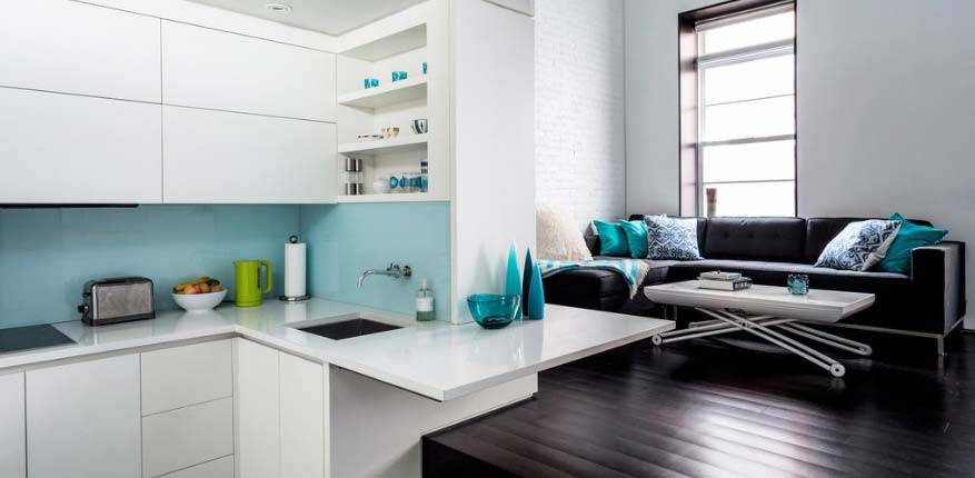 Если такая квартира находится в новостройке, то можно расширить пространство, задействовав в этом лоджию. Для этого ее нужно утеплить и остеклить, после чего она сможет служить обеденной зоной или рабочим кабинетом. Это даст возможность разгрузить кухню, а освободившиеся квадратные метры использовать с максимальной пользой.