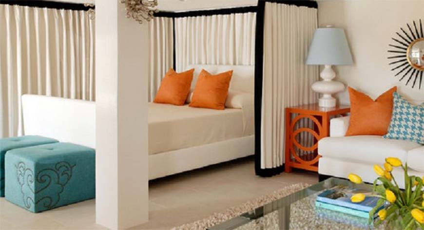 Использование ширм или занавесок. Этот метод позволяет не только разделить помещение, но и украсить его. Ширма может служить ярким элементом дизайна. Материалы могут использоваться разные, но для небольших квартир идеально подходят тканевые варианты, гармонирующие со шторами и прочими текстильными элементами.