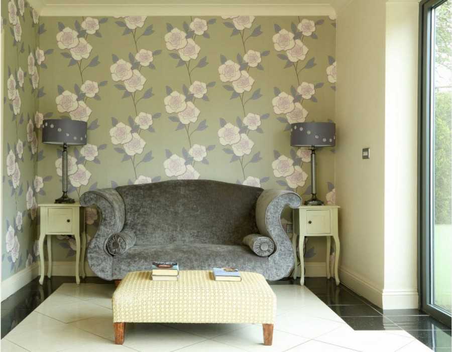 Еще неплохо смотрится зал, если только одна стена оклеена обоями. В этом случае выбирают преимущественно крупный рисунок