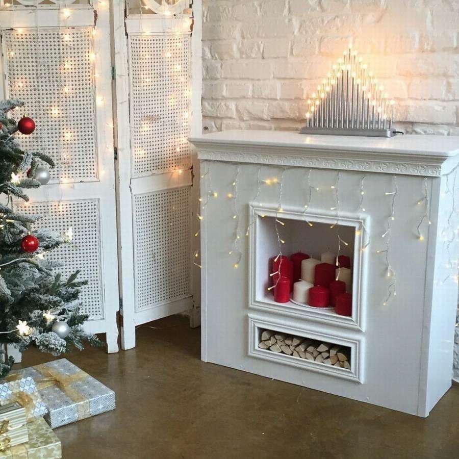 Кроме этого, фальшивый камин можно декорировать лампочками или новогодней гирляндой. Интересно будет смотреться гирлянда, намотанная на настоящие дрова – такой способ подойдет для камина из гипсокартона.