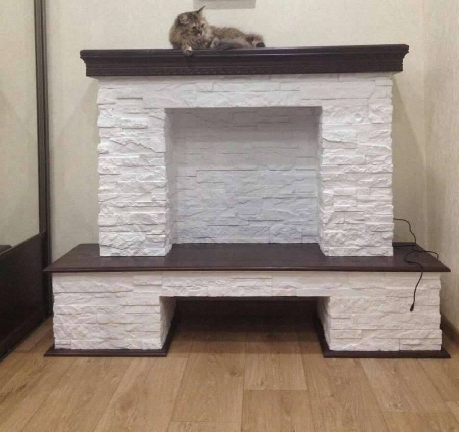 Как говорилось выше, декоративный фальш камин может быть создан из любых подручных материалов, в том числе картона. Его «топка» не обязательно заполняется имитацией живого огня. Она может быть просто нишей, в которой хранятся различные предметы – например, дрова. Однако декоративные электрические камины сразу же рассчитываются на установку электроприбора. В зависимости от того, будет он только визуализировать пламя или давать нагрев, выбирается конструкция портала и способ его создания – с защитой от избыточного нагрева или без.