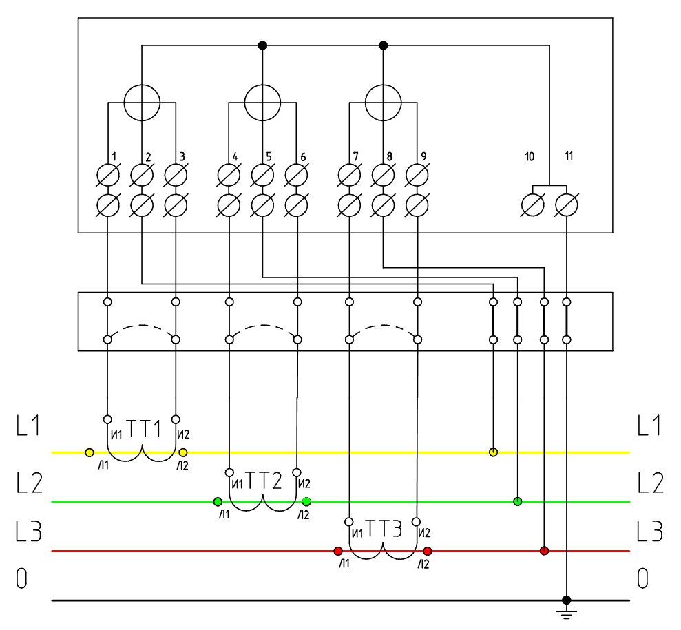 Цепи тока и напряжения в этой схеме, которую еще называют «десятипроводной» (по количеству используемых проводов), разделены. Подобное разделение цепей напряжения и тока позволяет повысить электробезопасность и легко проверять правильность подключения.