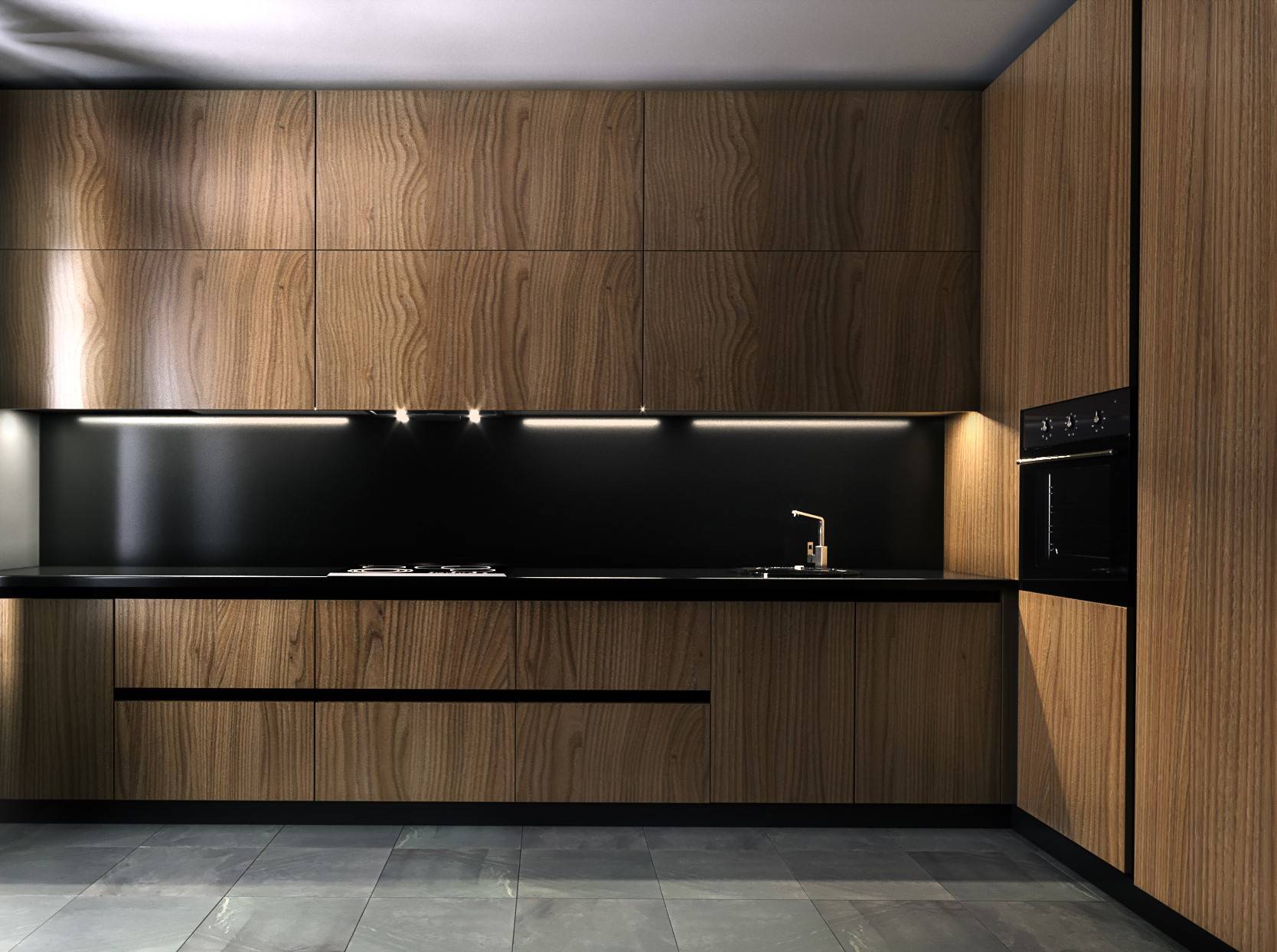 Шпон подойдет любителям классики. Тем, кто ценит дорогой внешний вид и приятные тактильные ощущения от мебели. Это тонкий слой дерева, который наклеивается на МДФ-плиту. Внешне такую кухню сложно отличить от массива. Главные качества этого материала: он натуральный и просто красивый. Причем как и любое другое дерево не становится хуже со временем, а только приобретает шарм.