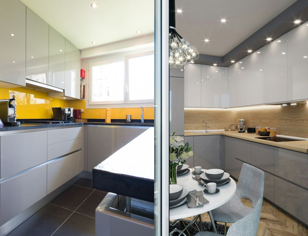 Стандартные способы расстановки мебели на кухнях до 6 кв.м. — угловая (Г-образная и П-образная), линейная и островная. Маленькие кухни и кухни близкие к квадратной форме следует делать угловыми. Линейная расстановка лучше подойдет для вытянутой и узкой (пенал) кухни. Причем можно не одну, а две стены занять мебелью, расположив мебель параллельно.
