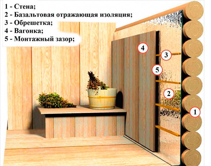 В этой конструкции уже активно используется алюминиевая фольга или пенополиэтиленовый теплоизолятор с отражающим слоем. Так как стены парилки получаются достаточно теплыми, нет смысла расходовать внутреннее тепло на вынос точки росы как можно дальше к наружной поверхности бруса и блока.