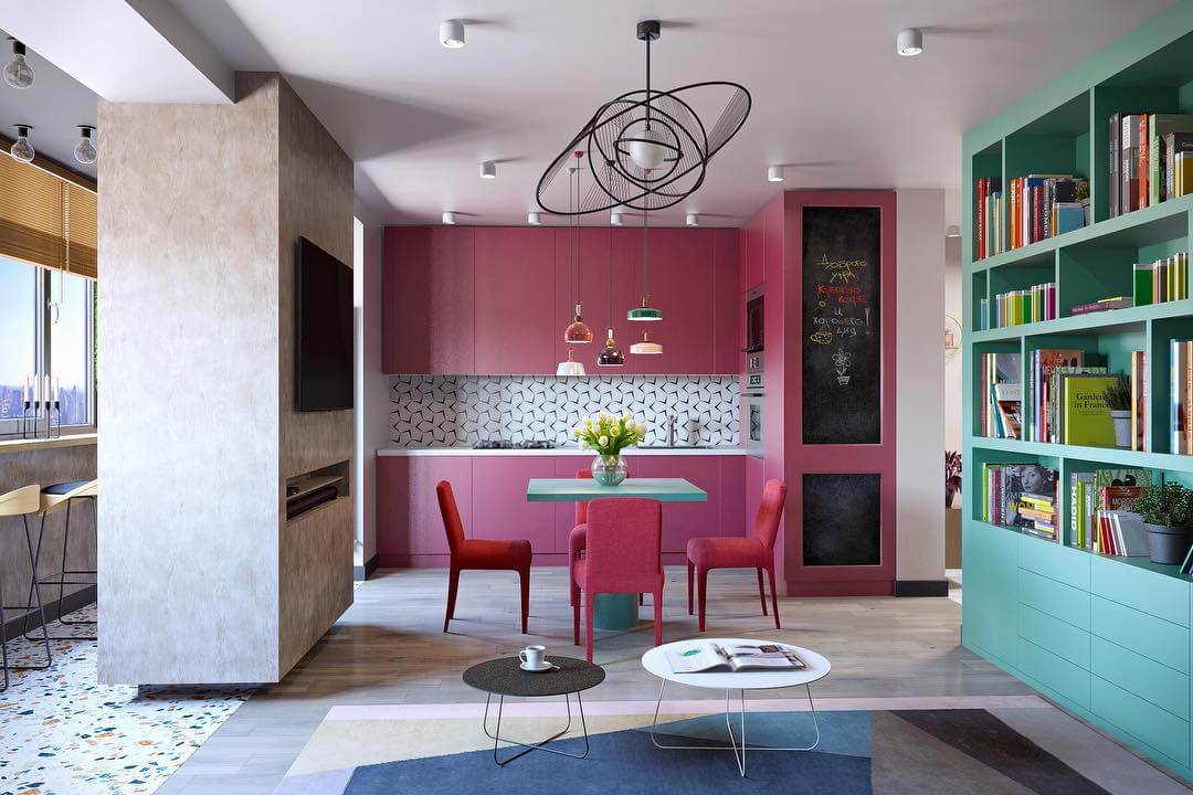 На фото салатово-лиловый интерьер с элементами поп-арт