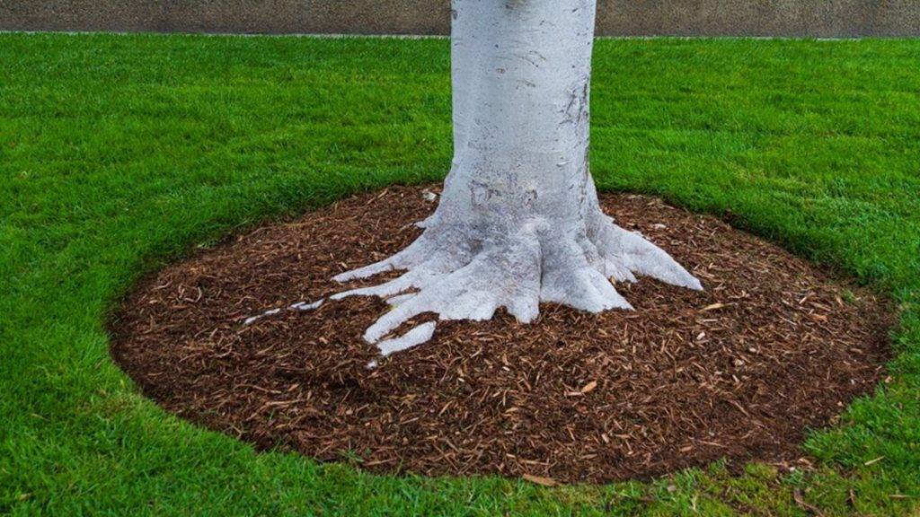 Диаметр круга примерно равняется размаху кроны дерева. Если такое мульчирование невозможно, то минимум – 1,5 м.