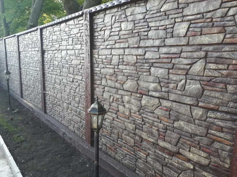Формы для производства декоративного камня повторяют в точности фактуру натурального материала. Современная технология нанесения краски позволяет получать стойкое и качественное покрытие. Палитра выглядит естественно. На первый взгляд забор из искусственного камня практически не отличается от природного материала.