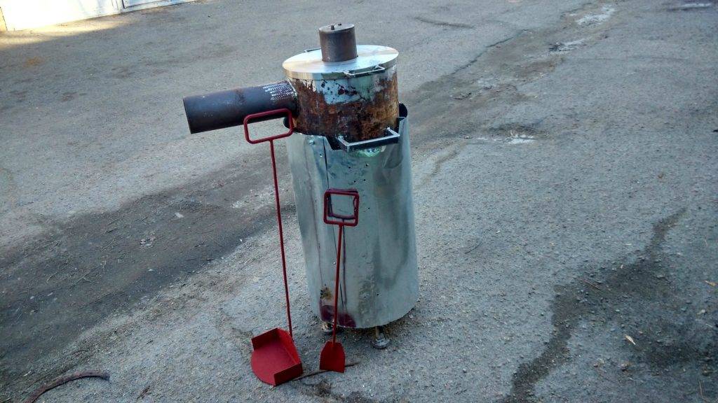 Такие печи создаются из больших баллонов, которые распиливаются на три части, каждая из которых имеет свою функцию. Данная конструкция обладает высоким КПД и долговечностью.