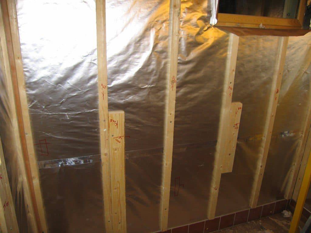 Прокладывание пароизоляции. Листы гидроизола, пергамента или другого подобного материала накладывают на стены внахлест (т. е. концы нового листа будут находить на 15 см на концы старого). Полученные швы склеиваются скотчем или похожим методом.