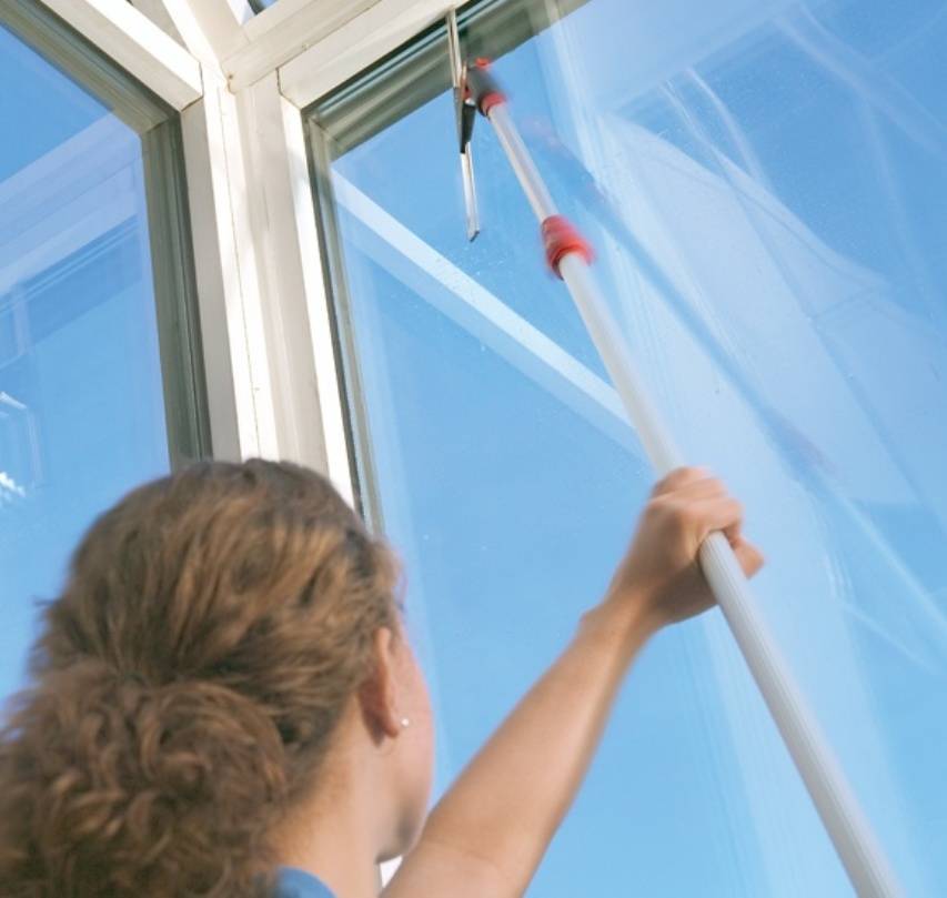 Сначала смывается основная грязь с поверхности стекла. Для этого можно использовать просто теплую воду, салфетку из микрофибры или специальную щетку для мытья. Если окна высокие и до верхнего окна рукой не дотянуться, используется телескопическая штанга.