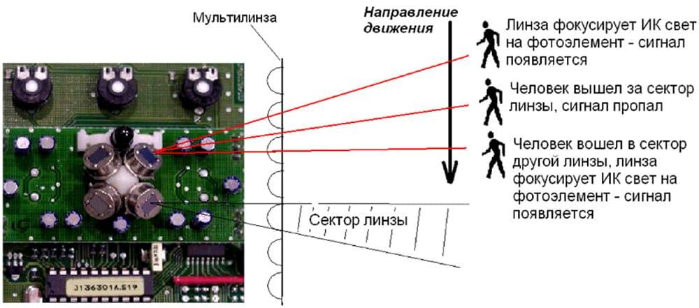 Датчик для детектирования применяет ИК-лучи. Если двигаться от луча к лучу, то устройство замечает активность и реагирует. Когда проходишь прямо на луч, чувствительность сенсора минимальна и прибор может не сразу на вас среагировать.