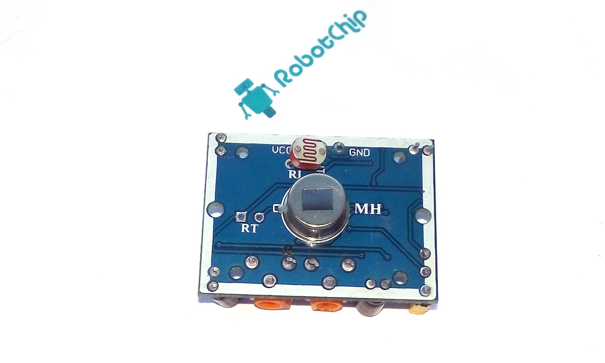 Подключение:В следующим примере используем туже схему, что и примере №1, только добавили фоторезистор. Место для установки фоторезистора расположено рядом с выходным разъемом, обозначение на плате как «RL». Можно припаять напрямую на плату или воспользоватся штыревым разъемом, для удобного подключения Dupont провода. Главное, чтобы фоторезистор не был закрыт от естественного освещения комнаты, а так же был защищен от света лампы, которую используем как нагрузку. На рисунке ниже показано, куда устанавливать фоторезистор.