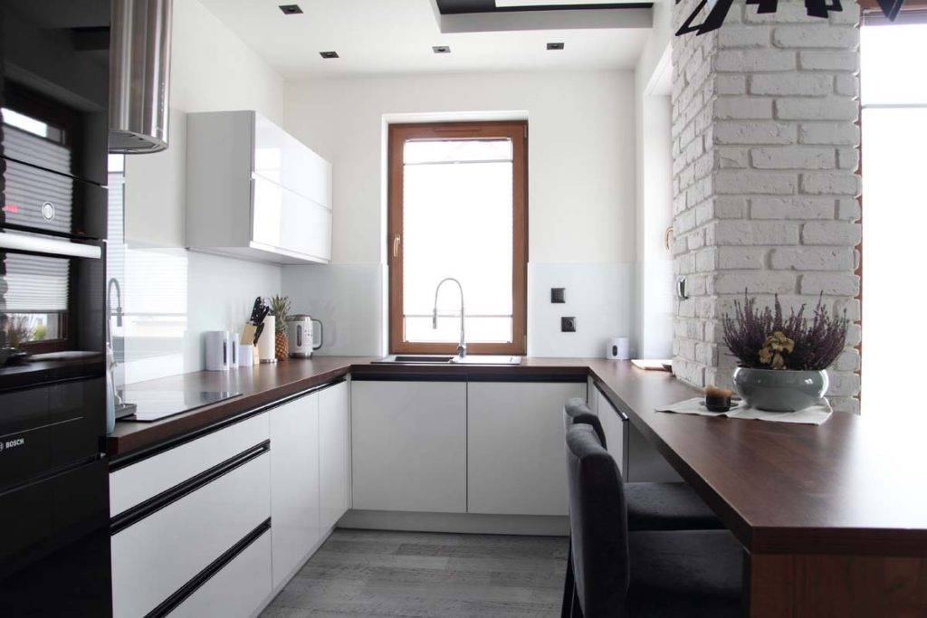 П-образный дизайн для маленькой кухни. Выразительно, объемно, функционально, но с одним большим минусом – для столовой не остается места. Мебель, техника занимают обе стены. Под окном располагается рабочая поверхность. Обеденную зону приходится выносить за пределы помещения.
