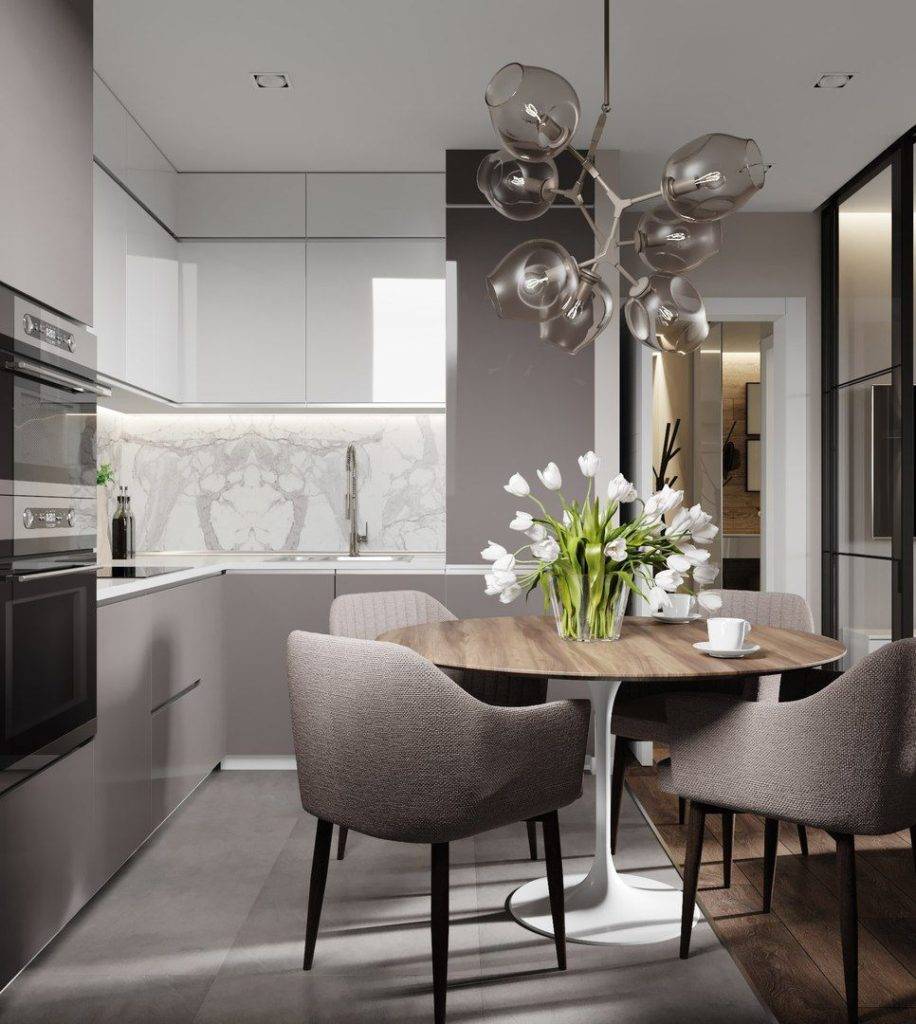 Лучше всего визуально разделить помещение на отдельные зоны — рабочую и обеденную. В рабочей зоне будет стоять гарнитур со встроенной бытовой техникой, обеденная зона может находиться в углу, либо у стены. Устанавливать стол в центре нельзя, так как он попросту затруднит перемещение по кухне.