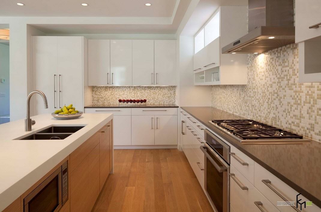 Иногда рабочую зону на кухне оформляют с помощью зеркальной плитки, мозаики, деревянных панелей. Сделать такой необычный фартук на кухне самостоятельно довольно сложно, поэтому встречаются подобные варианты в большинстве случаев в помещениях, оформленных по уникальному дизайнерскому проекту.