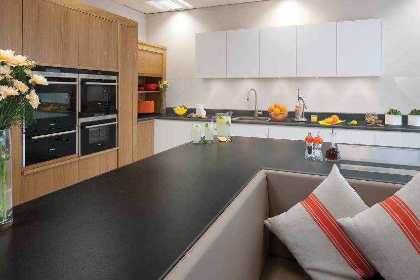 - Акрила. Они хорошо сочетаются с каменными столешницами. К их достоинствам относятся: долговечность, широкая цветовая гамма, устойчивость к механическим повреждениям, влагостойкость. К минусам акрила стоит добавить высокую стоимость.