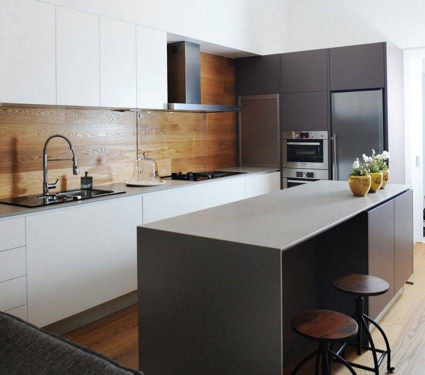 Цель такой отделки — привлечь внимание. Контрастный фартук может разбавить монотонность цветового решения кухни и сделать акцент именно на этой зоне;